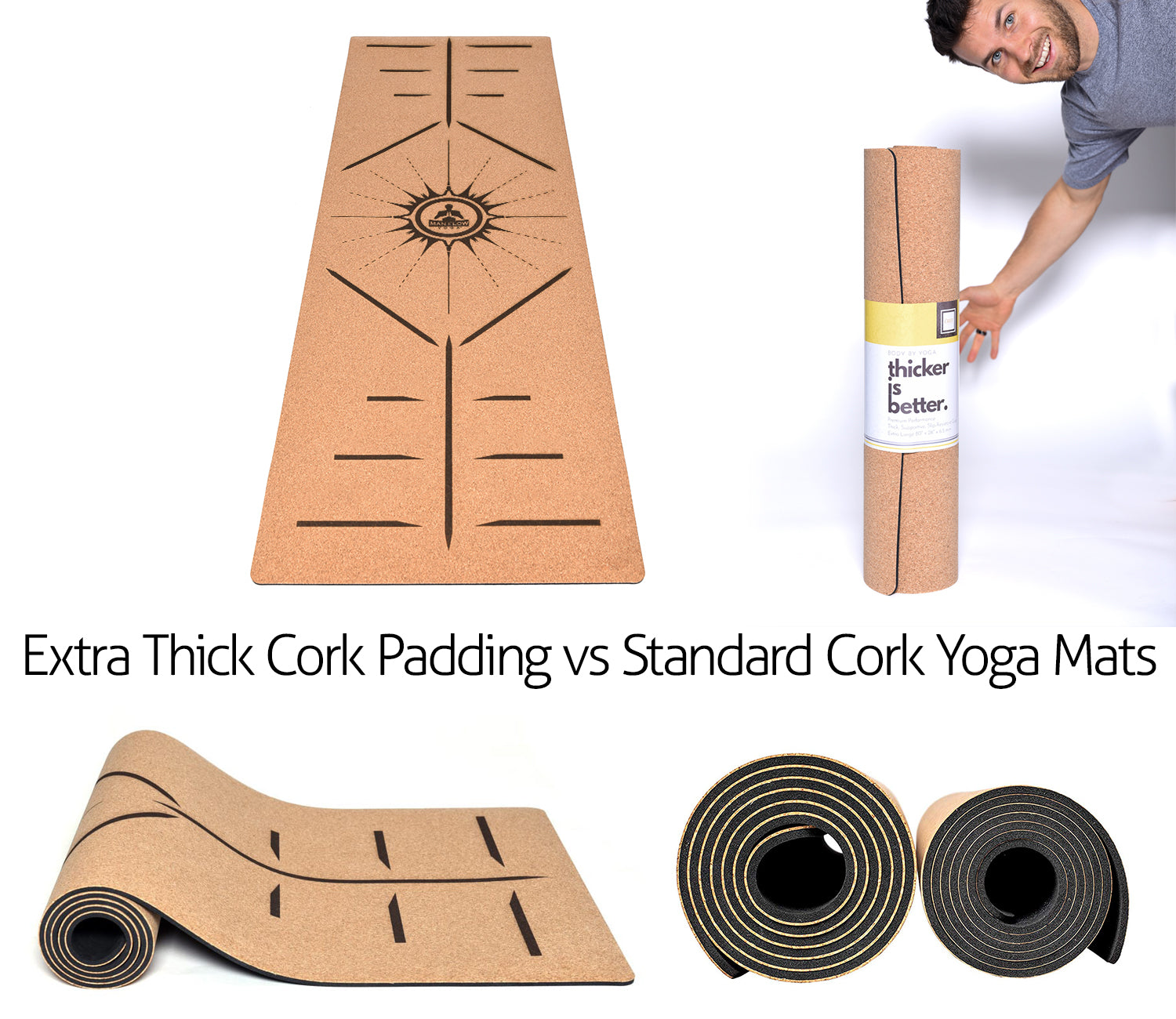 A luxury, soft, no-slip cork yoga mat that’s thicker, wider, and longer than traditional mats; a heavy duty, long-lasting yoga mat made from premium, sustainably-sourced cork and rubber, and featuring a built-in alignment system for perfect alignment in every posture.