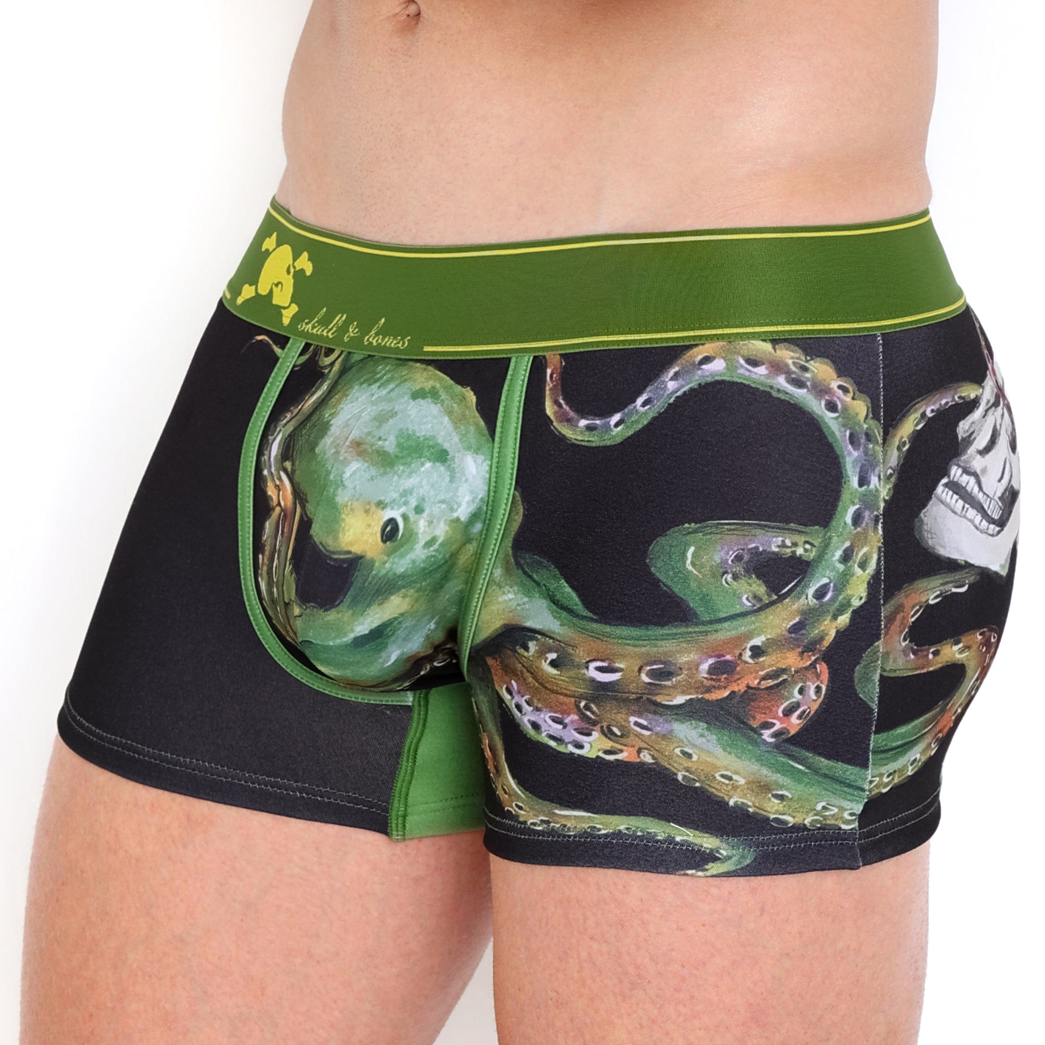 Introducing the Octopus Olive Trunk – LIMITED EDITION! Dive into ultimate comfort with a contour pouch, ‘no-roll’ waistband, and stretchable fabric. Move like an octopus in style with our signature Skull & Bones logo. Get yours before they swim away! #mensbasics #octopusolive
